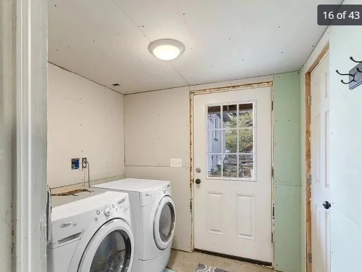 The biggest project of all was back in the first room we entered, the mudroom off the back door. At some point, the previous owners added a second bathroom and a laundry room as an extension at the back of the house, but had never finished the addition. There was no paint; the flooring was only partially complete; outlet covers were missing; etc.