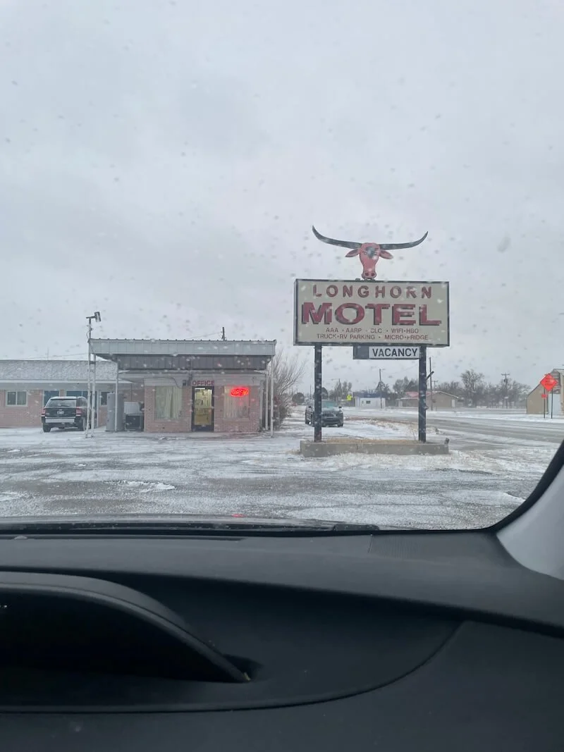 ❄️ Fun aside: We got snuck in a snowstorm on the way, every route to our planned pitstop in Colorado closed—New Mexico, Oklahoma, all of it. We ended up parked at a Longhorn Motel (fitting for Texans, no?) in Boise City, Oklahoma, eating Subway sandwiches from the Love’s gas station next door, surrounded by fellow stranded travelers. (Truly, the setup for a Hallmark rom-com or the pilot episode of a small-town apocalypse. Could’ve been either.)
