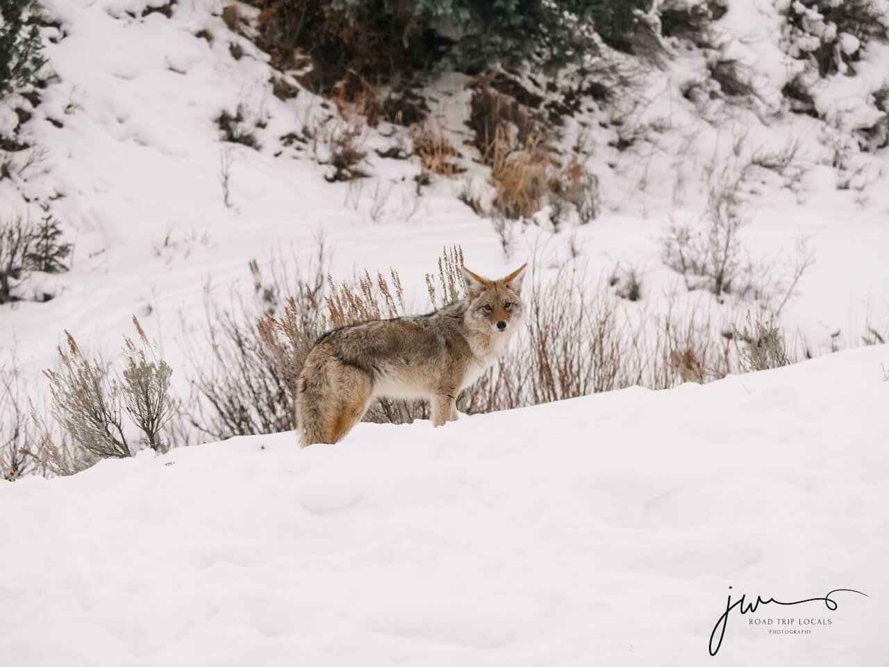Common winter sightings include wolves, bison, elk, coyotes, foxes, bighorn sheep, trumpeter swans, and bald eagles. Bears are hibernating and not visible.